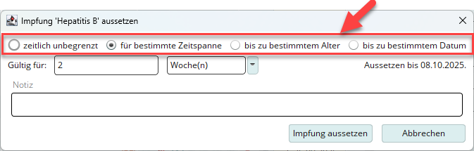 Wenn Sie den Haken bei <zeitlich begrenzt aussetzen> entfernen, wird die Impfung komplett ausgesetzt: