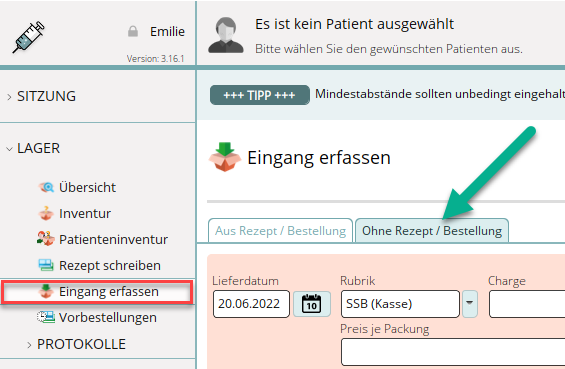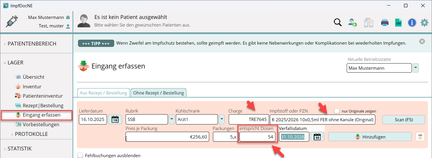 Im Menü <Lager> <Eingang erfassen> können Sie in der Registerkarte „ohne Rezept/Bestellung“ ihren aktuellen Impfstoffbestand eintragen. ImpfDocNE erlaubt hier auch, angefangene Großpackungen in einer Buchung zu erfassen:
