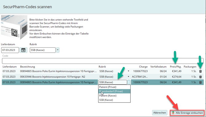 Sie können mehrere Impfstoffpackungen in einem Vorgang scannen und gesammelt einbuchen.