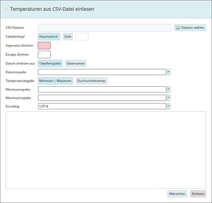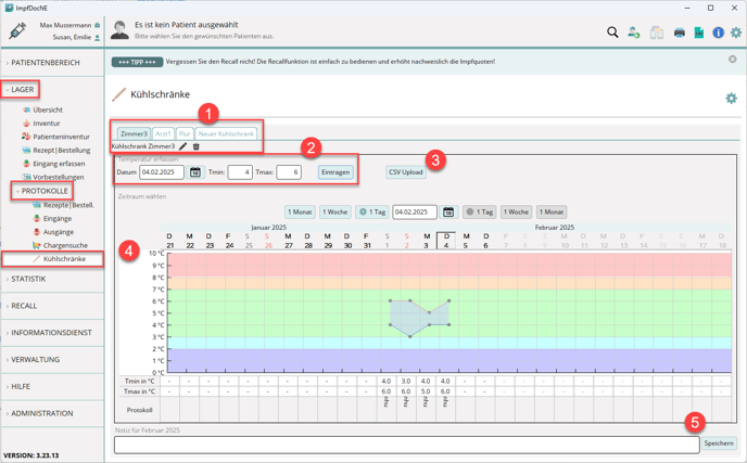 - Mit Klick auf "CSV Upload" können Sie protokollierte Kühlschranktemperaturen aus anderen Dateiformaten einlesen