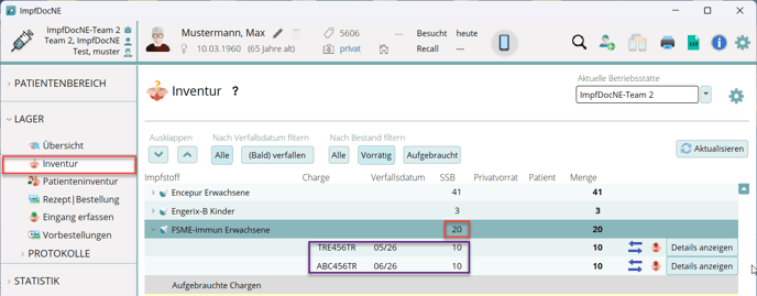 Sie haben 20 Impfstoffdosen unter dem Kostenträger Sprechstundenbedarf eingebucht, 2 unterschiedliche Chargen mit jeweils 10 Impfstoffdosen:
