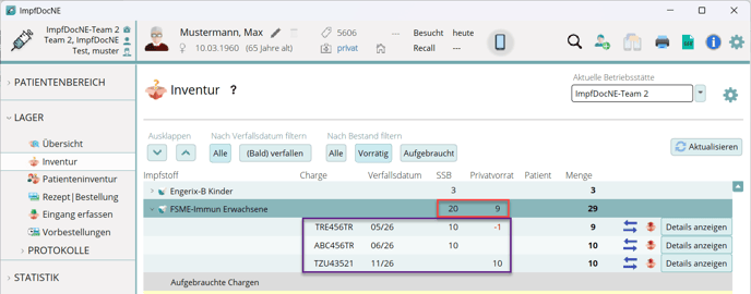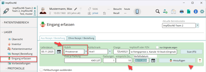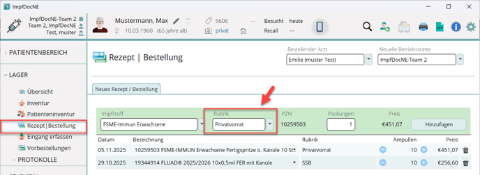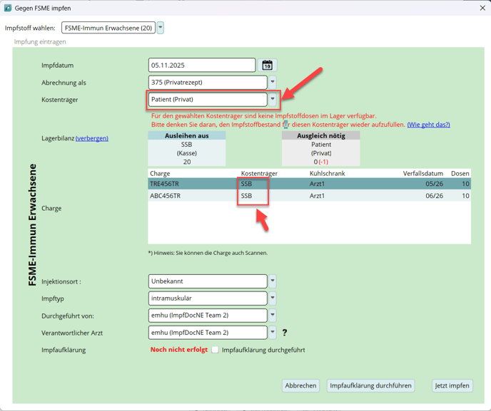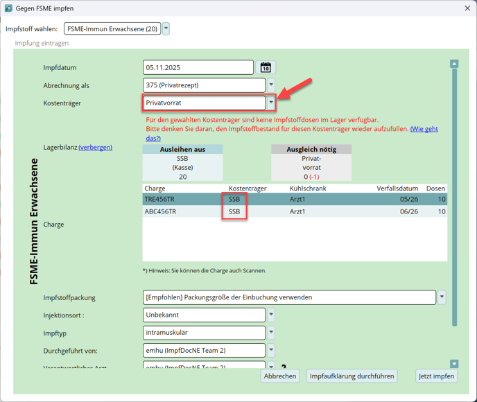 Beispiel 2: Privatpatient wird unter dem Kostenträger "Privatvorrat" geimpft