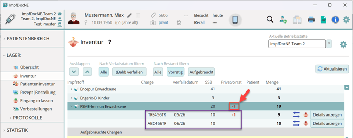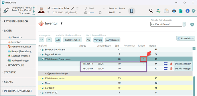 Der Impfstoff sollte unter dem Kostenträger "Patient (privat)" eingebucht werden, sodass der Minusbestand beglichen wird: