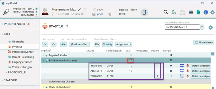 Wenn z. B. ein Privatpatient mit einem Impfstoff aus dem Sprechstundenbedarf (SSB / Kasse) geimpft wird, wird die Dosis dem privaten Vorrat (Praxisbedarf (Privat) oder Patient (Privat)) belastet.